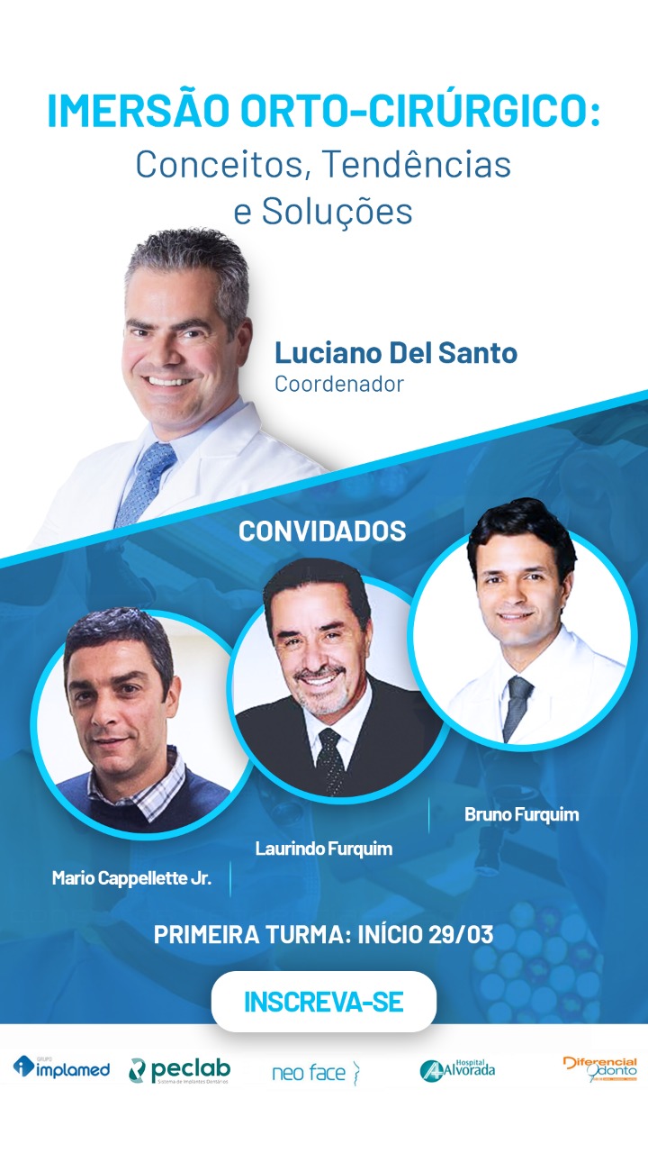 Imersão Orto-cirúrgico, conceitos, tendências e soluções ministrado pelos professores Dr. Luciano Del Santo, Dr. Mário Cappellette, Dr. Laurindo Furquim e Dr. Bruno Furquim.