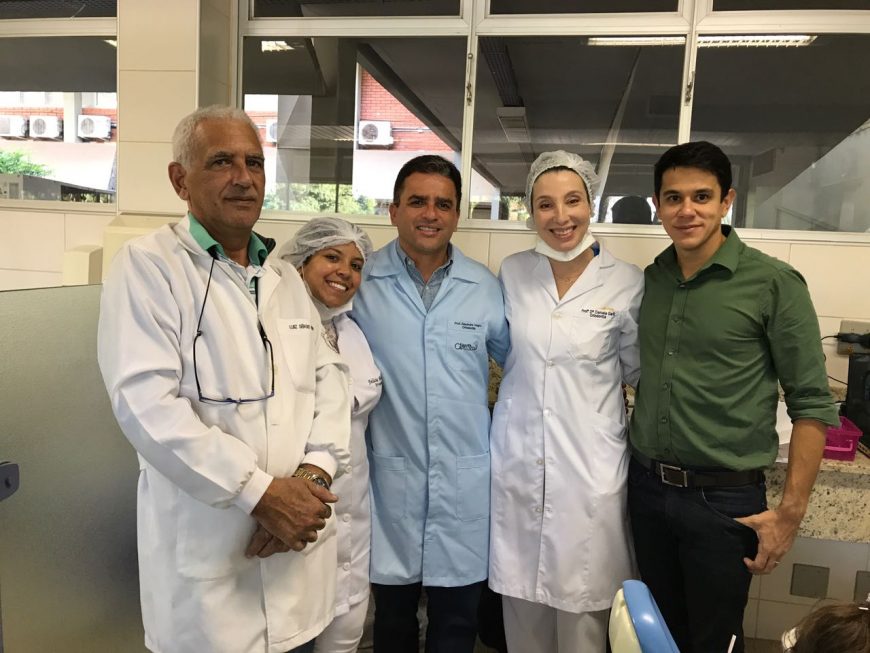 A PecLab apoiando estudo clínico de tratamento precoce da classe III esquelética através da técnica MARPE. Este estudo está sendo realizado na Faculdade de Odontologia da USP em Bauru e é orientado pela Professora Dra. Daniela Garib. Para este estudo clínico a PecLab forneceu os disjuntores MARPE 2S- com 2 mini-implantes MARPE- e os mini-implantes HS Button para protração da maxila após abertura da sutura palatina mediana. Da esquerda para direita Dr. Luiz Sérgio Vieira, Doutoranda Felícia Miranda, Professor Alexandre Magno, Professora Dra. Daniela Garib e Prof. José Bastos.