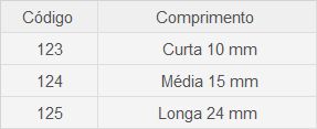 – Comprimento haste 11 mm (curta), 15 mm (media) e 24 mm (longa)